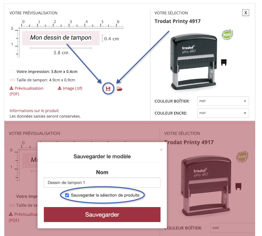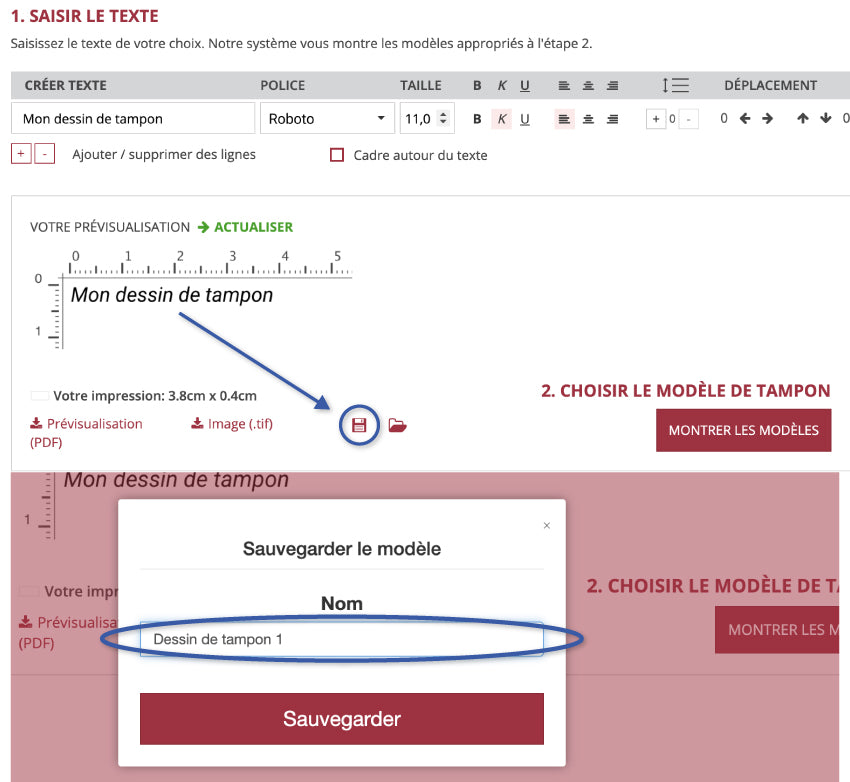 Vous pouvez sauvegarder un 'template' avec ou sans modèle de tampon correspondant. Si vous avez déjà sélectionné un modèle de tampon notre système vous demandera si vous souhaitez également le sauvegarder.