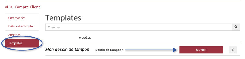 Vous pouvez facilement ouvrir vos 'templates'. Pour faire ça, connectez-vous à votre compte et sélectionnez le 'template' souhaité. Celui-ci est alors automatiquement affiché dans le designer en ligne et peut être commandé ou modifié à nouveau.